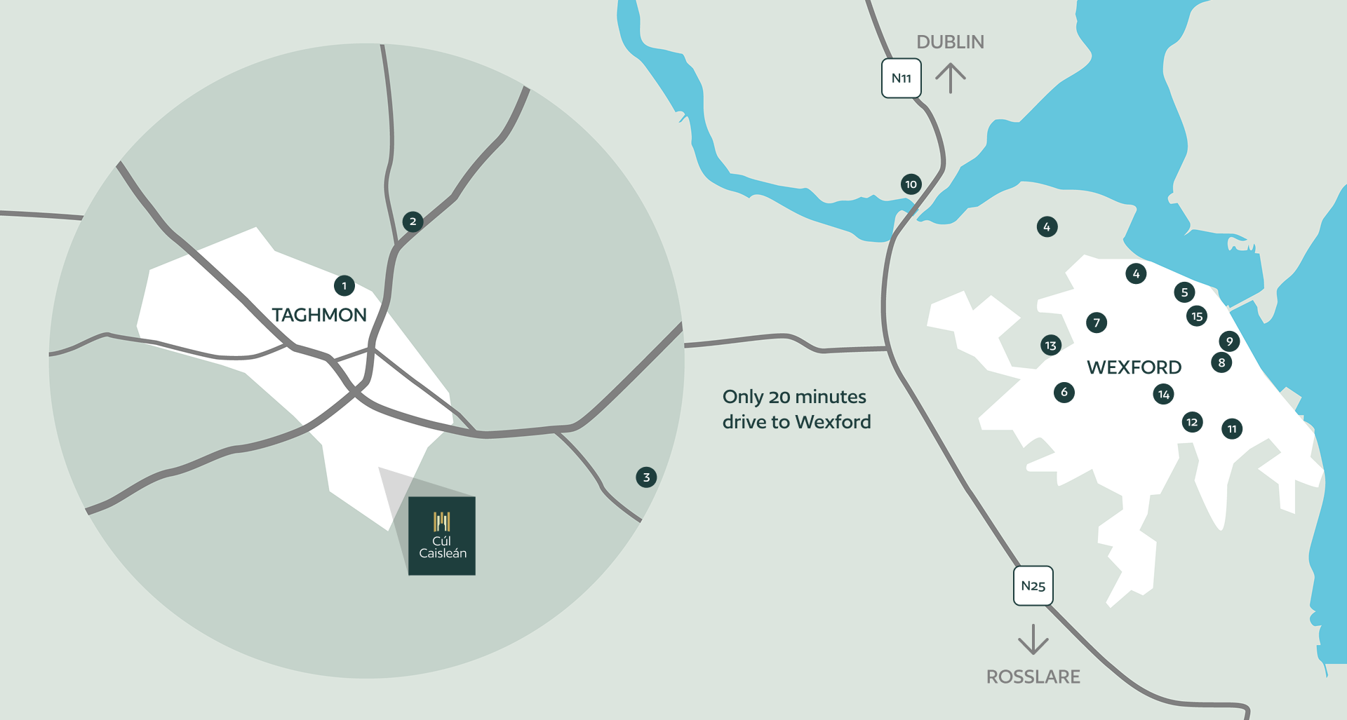 Cúl Caisleán is located just outside the village of Taghmon, placing local schools, shops and community facilities within easy reach. Wexford Town and its wider range of services, retail and transport links are also close by, supporting practical, well-connected day-to-day living.